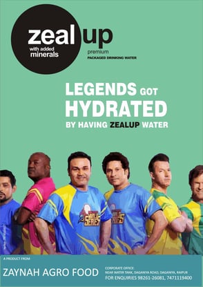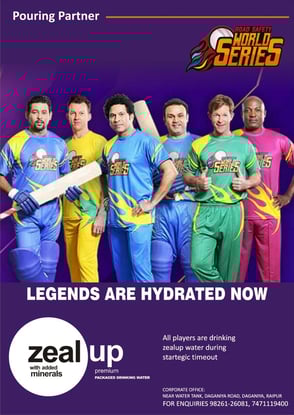 Zealup was the official hydration partner for The Road Safety World Series, an initiative by Road Safety Cell of Maharashtra in association with Professional Management Group (PMG) spearheaded by Little Master Sunil Gavaskar as the commissioner of the series and Sachin Tendulkar as the brand ambassador of the league.